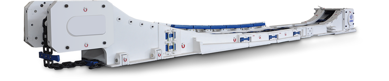 本系列產品中部槽是由鑄造槽幫與 中、底板焊接而成,涵蓋槽寬從630~ 1250mm全系列刮板輸送機,能夠適 應一般中厚煤層、特厚煤層,配合配套 的順槽轉載機、破碎機、轉載機自移和 皮帶機自移機尾等,能夠滿足年產50 ~1000萬噸的井工采煤工作面的使用 要求。